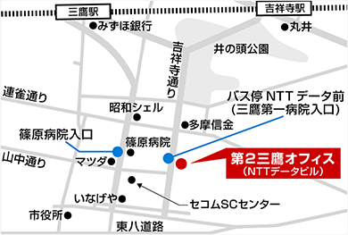 ・京王線「千歳烏山」駅北口からバス約20分(吉02系統)「NTTデータビル前」下車 徒歩約7分