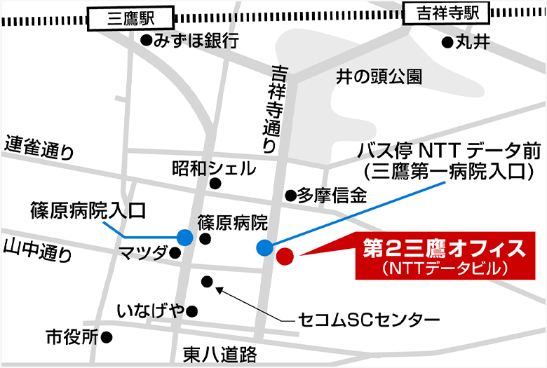 ・京王線「千歳烏山」駅北口からバス約20分(吉02系統)「NTTデータビル前」下車 徒歩約0分