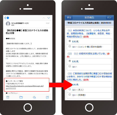 全社員に、毎日朝に健康状態の報告を習慣づけることで、感染疑いのある社員を早期に発見することが可能です。「セコム安否確認サービス」のテンプレートや、任意の報告項目で簡単に回答可能です。