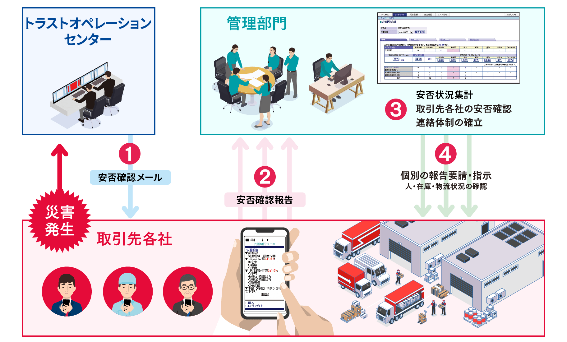 製造業を中心にサプライチェーンの構築が進展し、原材料の調達~製造・生産~流通・物流~販売に関する情報が管理され、それぞれの業界で効率化・緊密化が図られています。従って、災害時には、自社の社員・家族だけではなく、取引先担当者の「安否」の確認が必須となっています。また、安否が確認された取引先担当者を通じて、工場等の被災状況(生産設備や在庫の状況、納品の可否)を迅速に把握し、それらの情報を基に、人の手配をはじめとした業務の正常化に向けた対応策を実施し、経営へのインパクトを最小限に食い止めることが必要です。
