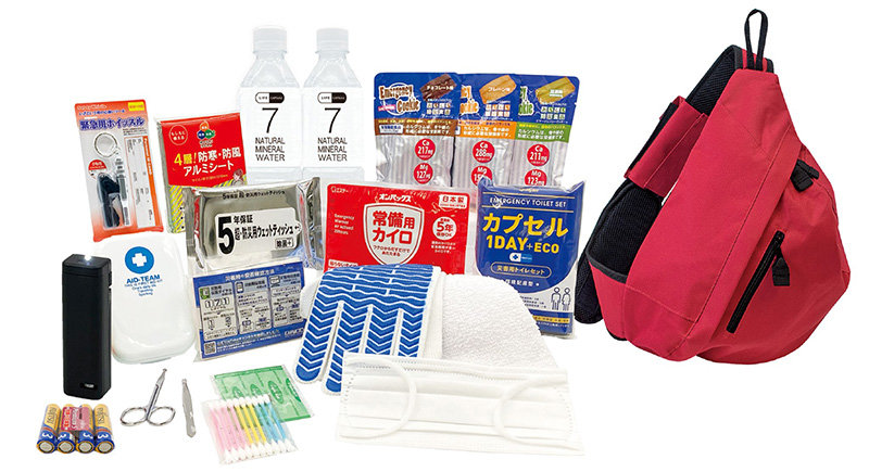 ワンショルダーバッグ×1個、簡易救急セット(ハサミ1個、ピンセット1個、絆創膏10枚、綿棒10本)×1セット、スベリ止め手袋×1双、常備用カイロ×1個、ポケットティッシュ×1個、ウェットティッシュ×1個、アルミブランケット×1個、保存水500ml×2本、エマージェンシークッキー×3食(チョコ・プレーン・抹茶)、簡易トイレ5回分×1個、緊急用ホイッスル×1個、マスク×1枚、マルチ充電LEDライト×1個、単3形乾電池×4本