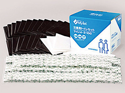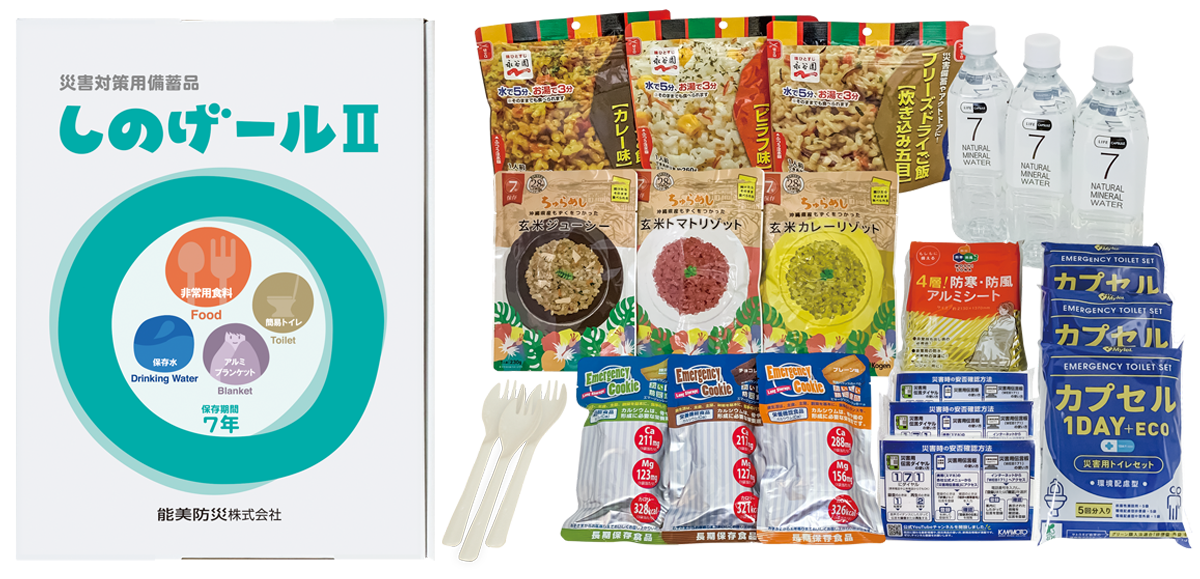 保存水500ml×2本、防災備えFOOD+×3、簡易トイレ5回分×3、アルミシート×1個、ウエットティッシュ×1個、カイロ×3個、ポケットティッシュ×3個