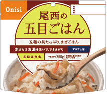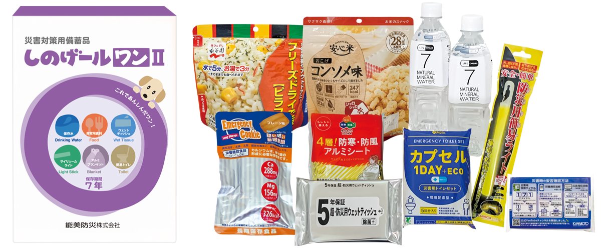 保存水500ml×2本、エマージェンシークッキー(プレーン)×1袋、安心米おこげ(コンソメ)×1食、永谷園フリーズドライご飯(ピラフ味)×1食、防災用簡易ライト×1本、マイレット1DAY+ECO(5回分)×1セット、ウェットティッシュ(20枚入)×1個、アルミシート×1個、ポケットティッシュ ×1個
