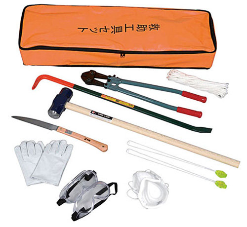 ショルダータイプ 背負い式工具セット 平バール、両口ハンマー、ボルトクリッパー、のこぎり、皮手袋2双、ゴーグル2個、防塵マスク2枚、ビニロンテープ 8mm×10mm、ホイッスル2個、背負い式バッグ