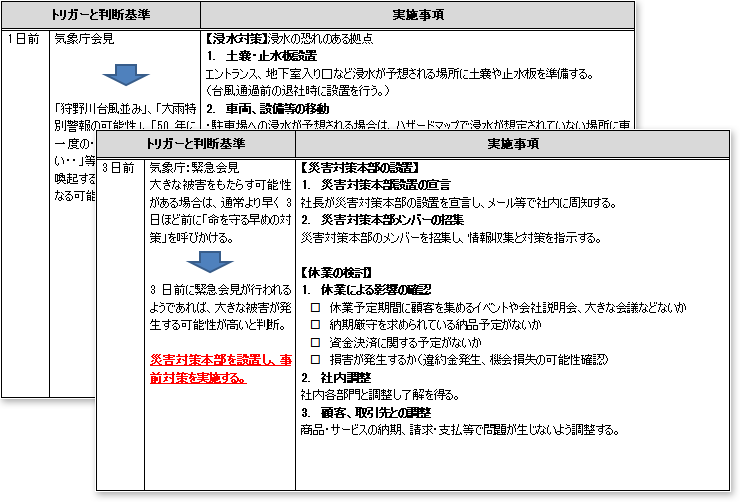 - 事前に対応策を講じるために必要な手順を日単位で作成(タイムライン)