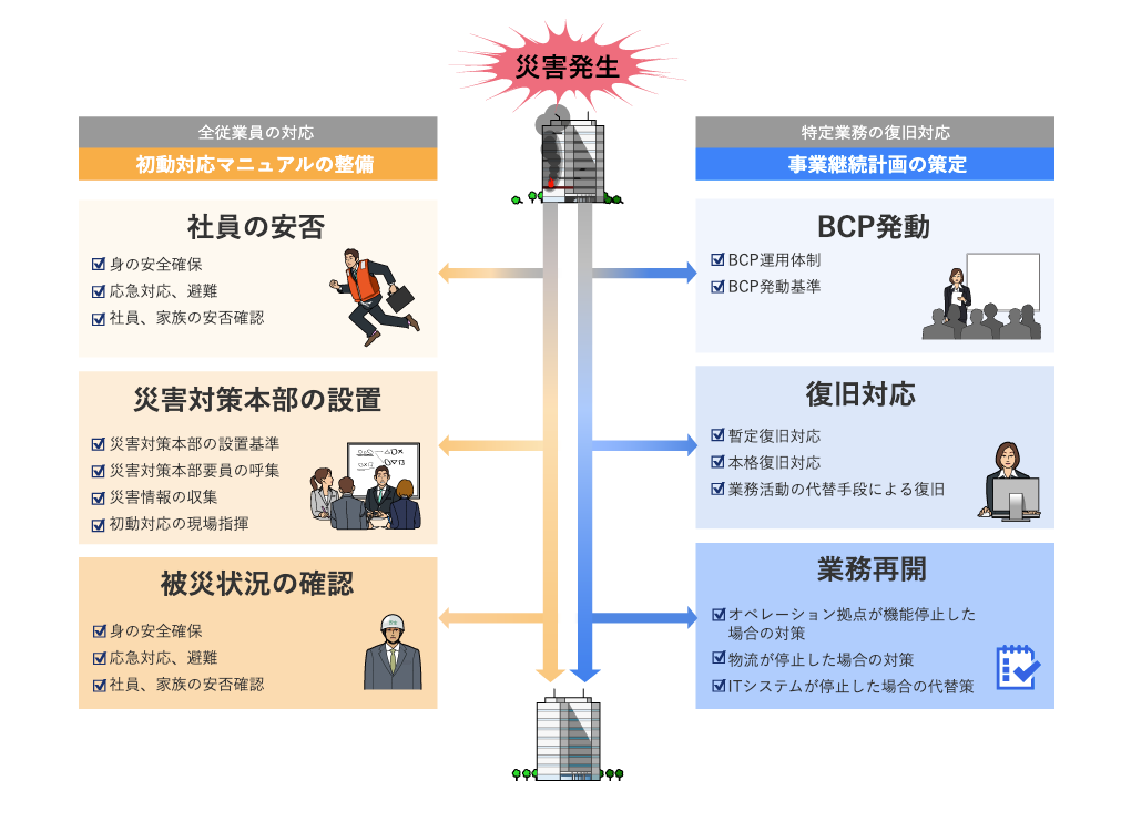 大規模地震等の発災時の被害を最小限にし、的確に事業を復旧するためには、初動対応に係る行動基準等を規定したマニュアル(初動対応マニュアル)とその後の事業復旧に係る計画(事業継続計画)を合わせて整備する必要があります。