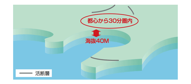都心からのアクセスが30分圏内(公共交通機関を利用)の「セキュアデータセンター®」は、活断層から離れ、地震による影響や液状化のリスクが低く、水害の恐れも極めて低い海抜40m の安定した地盤の上に立地しています。また、東京都が公表している地域危険度測定調査では安全性が最も高い「ランク1」に評価されています。