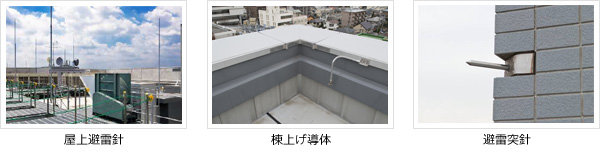 避雷針と棟上げ導体(建物屋上に導体を張り巡らす方式)の併用方式を採用し、側雷からも建物を保護するための避雷突針を設置しています。また、異常に高い電圧が瞬間的に発生する現象(サージ)から機器の損傷を防ぐため、過大な電圧を通常レベルまで制御する避雷器を設置しています。
