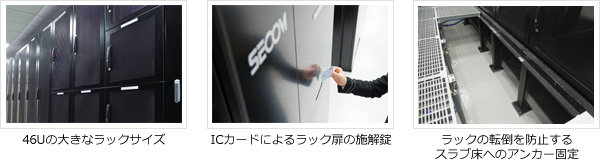 入館時に貸与するICカードでご契約ラックの施解錠を行うので、お客様による鍵の管理が不要です。ラックの施解錠状態は常時監視により厳格に管理され、解錠後放置した場合や、レバーハンドルを元に戻した際に扉を自動施錠。ICカード返却時にも施錠状態を確認します。また、46Uのラックサイズと最大800kg の積載荷重により、従来は困難であった大重量機器の搭載が可能。大容量化と集約化を実現します。