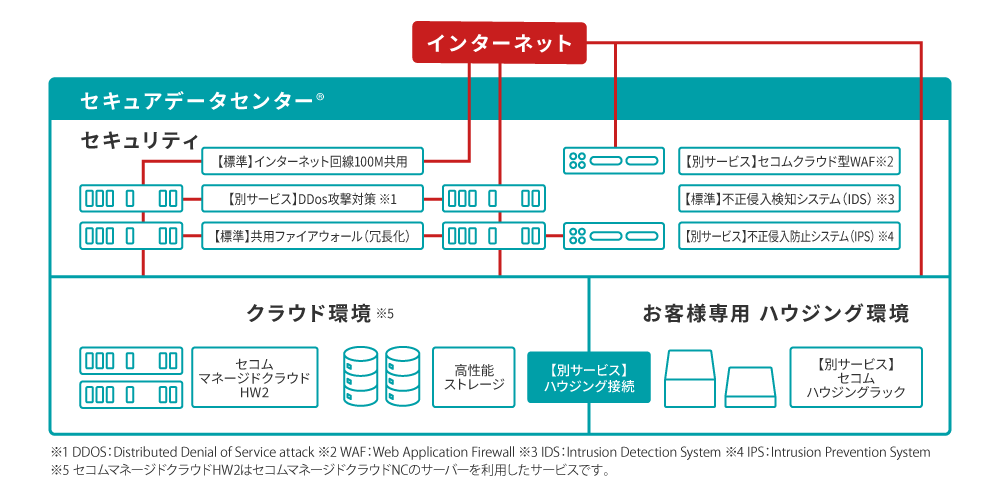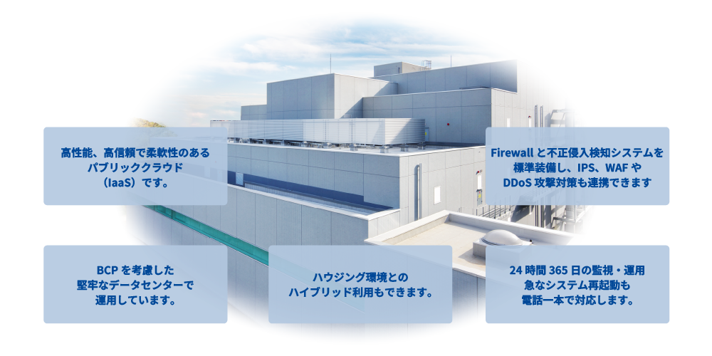 セキュアデータセンター®で提供する、ファイアウォール、不正侵入検知システム、バックアップを標準装備した、高性能・高信頼で柔軟性もあるパブリッククラウド(IaaS)です。ハウジング環境とのハイブリッド利用も可能です。