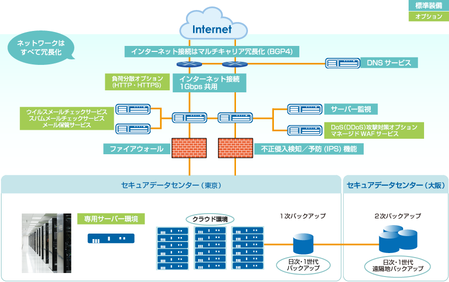 - インターネット回線を含めデータセンター内の機器はすべて冗長構成のため、障害に強い環境です。