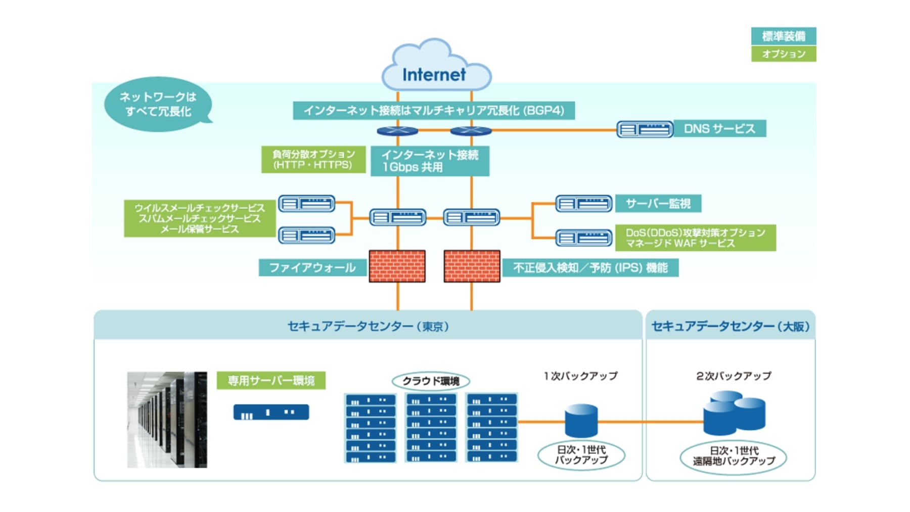 ハウジング環境とのハイブリット利用も可能です。ファイアウォールと不正侵入検知システムを標準装備し、IPS、WAFやDDoS攻撃対策も連携できます。