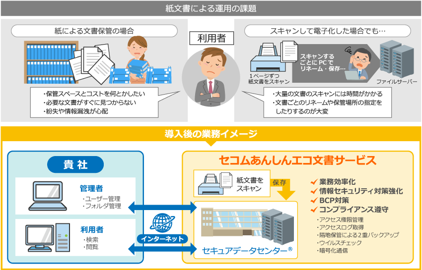 セコムトラストシステムズでは、既存のビジネス文書等をスキャニングし電子データ化して、安全なセキュリティ環境でお預かりするサービスを提供しています。