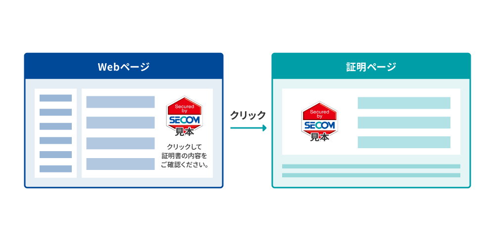 セコムトラストシステムズが審査し、実在性が証明されていることを確認いただくためのセコムWebステッカー(6角形の画像)と証明した内容を表示する証明ページをご利用いただけます。