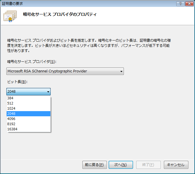 [暗号化サービス プロバイダ(S)]のプルダウンから[Microsoft RSA SChannel Cryptographic Provider]を択一し、作成する鍵の[ビット長(B)]から[2048]を択一してください。
