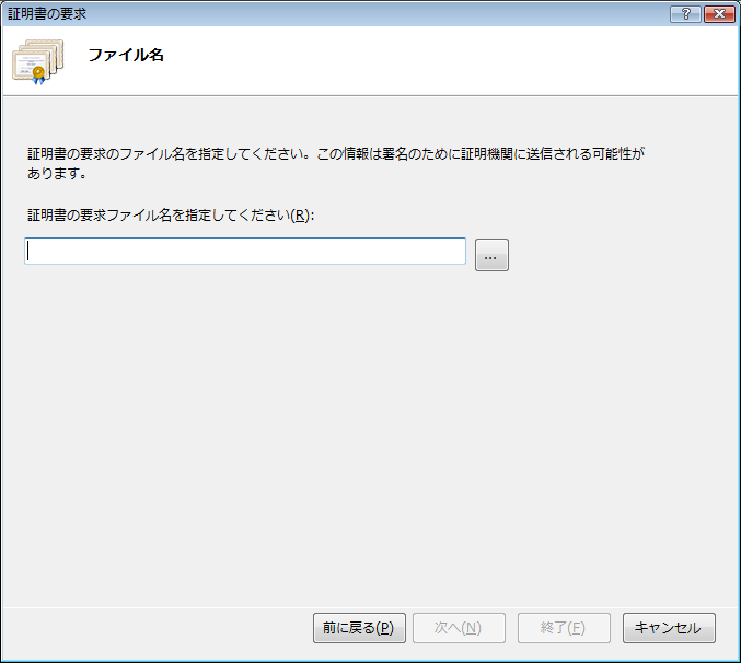 確認画面がないので、入力したファイル名を確認してから、[終了(F)]ボタンを実行してください。CSRが生成され、指定したファイルに格納され、ダイアログが閉じます。