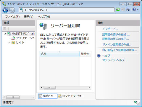 画面中央にある[サーバー証明書] アイコンを実行 (あるいは、 アイコンを択一してから [機能を開く] を実行) します。