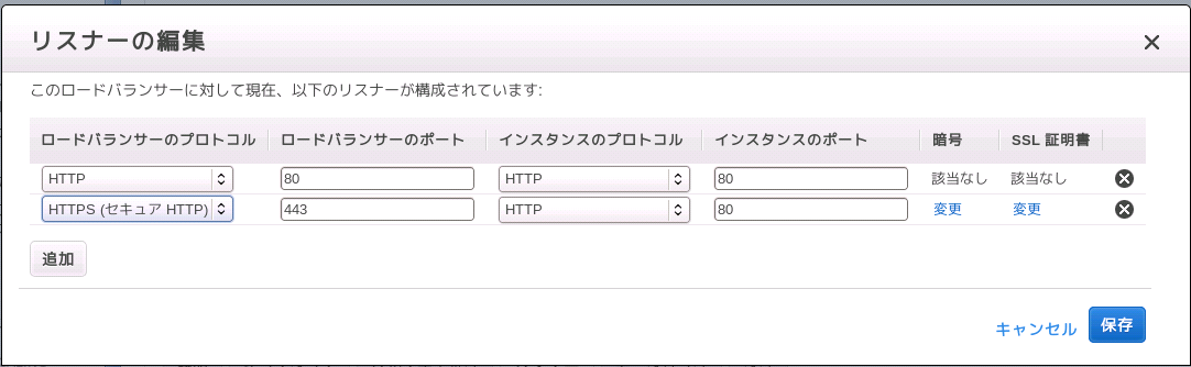 リスナーの編集画面でHTTPSプロトコル行の「SSL 証明書欄」の「変更」のリンクをクリックしてください。