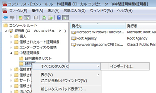 画面右の[操作]より、[インポート]を実行してください。<証明書のインポート> ダイアログがポップアップします。