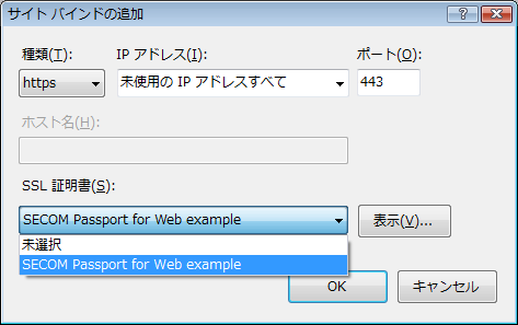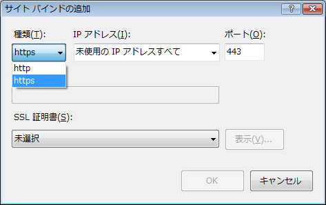 [種類(T)]プルダウンから[https]を択一してください。[SSL 証明書(S)]のプルダウンが表示されます。