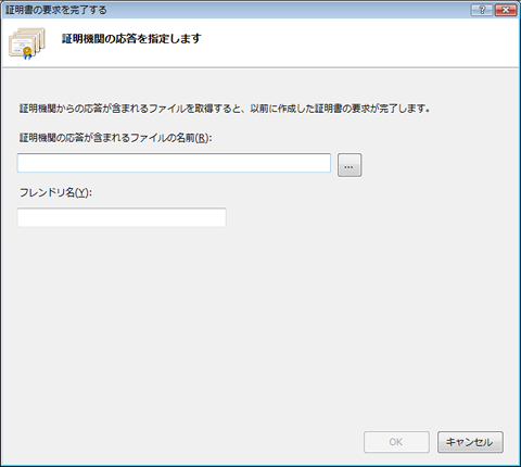 [証明機関の応答が含まれるファイルの名前(R)]にサーバー証明書のファイルの名前を入力し、[フレンドリ名(Y)]にお好みの名前を入力し、[OK] ボタンを実行してください。ダイアログが閉じます。