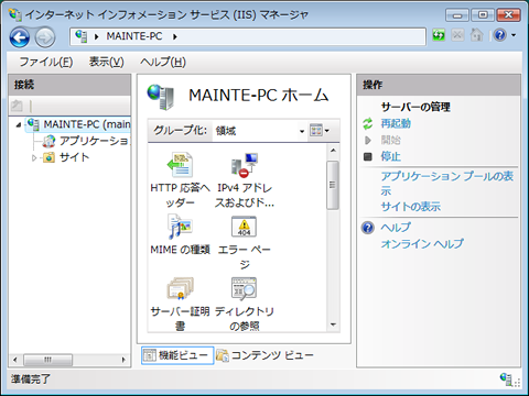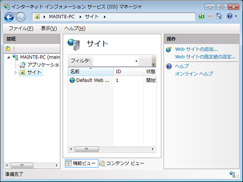 [インターネット インフォメーション サービス (IIS) マネージャ]の画面左にある[サイト]アイコンを実行してください。画面の中央にサイトのリスト・ボックスが表示され、画面右の表示が変わります (もしすでに実行済みであれば、変わらないこともあります)。