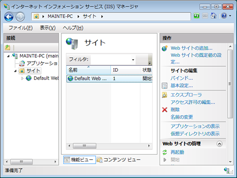 [インターネット インフォメーション サービス (IIS) マネージャ]の画面左にある[サイト]アイコンを実行してください。画面の中央にサイトのリスト・ボックスが表示され、画面右の表示が変わります(もしすでに実行済みであれば、変わらないこともあります)。