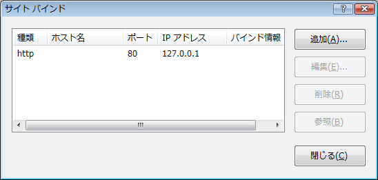 <サイト バインド>ダイアログがポップアップします。[追加(A)...]ボタンを実行してください。