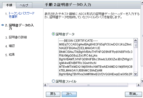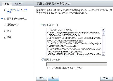 サーバー証明書の「-----BEGIN CERTIFICATE-----」から「-----END CERTIFICATE-----」の部分までコピーし、[証明書データ]の入力欄に貼り付けてください。