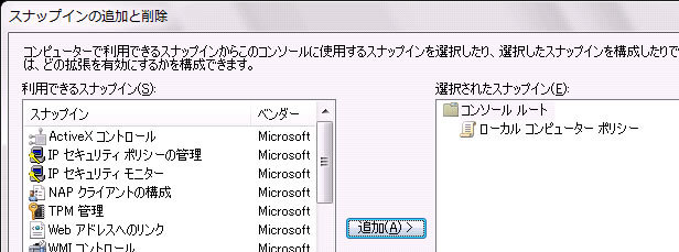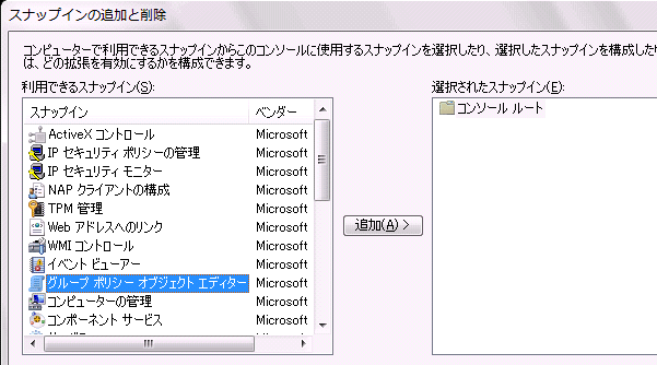 [利用できるスナップイン(S)]リストボックスから[グループ ポリシー オブジェクト エディター]を択一してから[追加(A) >]ボタンを実行してください。
