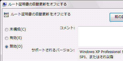 「コンピューターの構成\管理用テンプレート\システム\インターネット通信の管理\インターネット通信の設定」を択一し、「ルート証明書の自動更新をオフにする」の状態を確認してください。