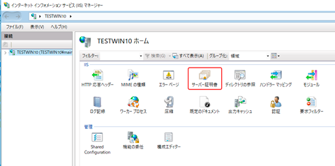 画面左にあるサーバー名を選択し、画面中央にある [サーバー証明書]アイコンを実行します。