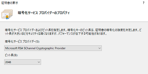 [暗号化サービス プロバイダ(S)] のプルダウンから [Microsoft RSA SChannel Cryptographic Provider] を択一し、 [ビット長(B)] は [2048] を択一します。