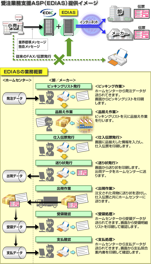 EDICサービスは、経済産業省の平成20年度ホームセンター業界における流通システム標準化実証実験に参加し、DIY業界の卸側システム(共同ASP)としてホームセンターと流通BMSでデータ交換を行い実業務に適合できることが実証されました。