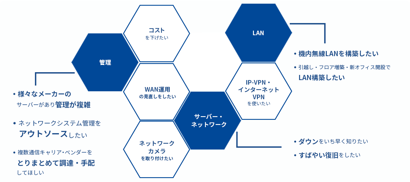 ベンダーのサービスにお客様のご要望を合わせていただくのではなく、お客様のご要望を最大限に実現する柔軟な提案をご提供しています。ネットワークにまつわるあらゆるサービスを有するセコムトラストシステムズならではの、お客様に寄り添った個別最適なネットワークのデザインが可能です。