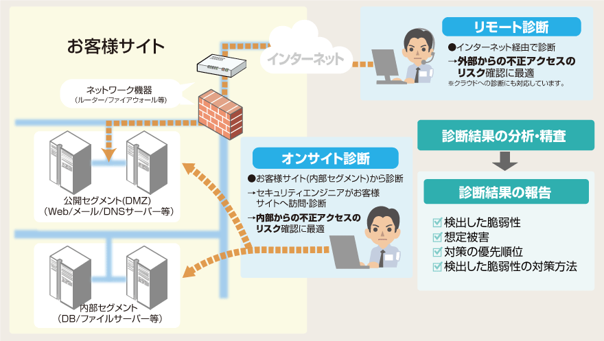 高度な診断技術を持つセキュリティエンジニアがお客様のサーバー・ネットワーク機器に対して診断を行い、問題点を洗い出し、より安全・安心なサーバー・ネットワーク機器の運用を支援するサービスです。