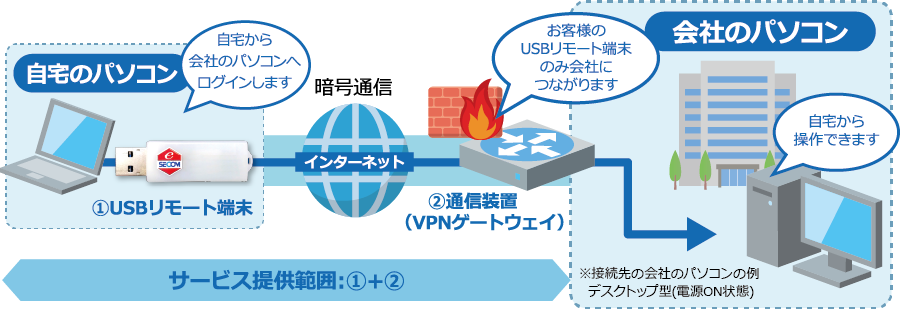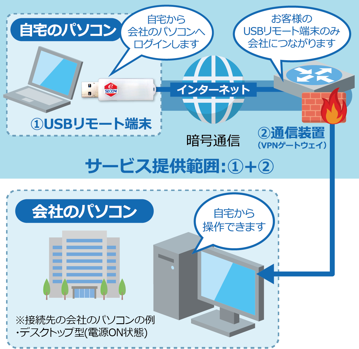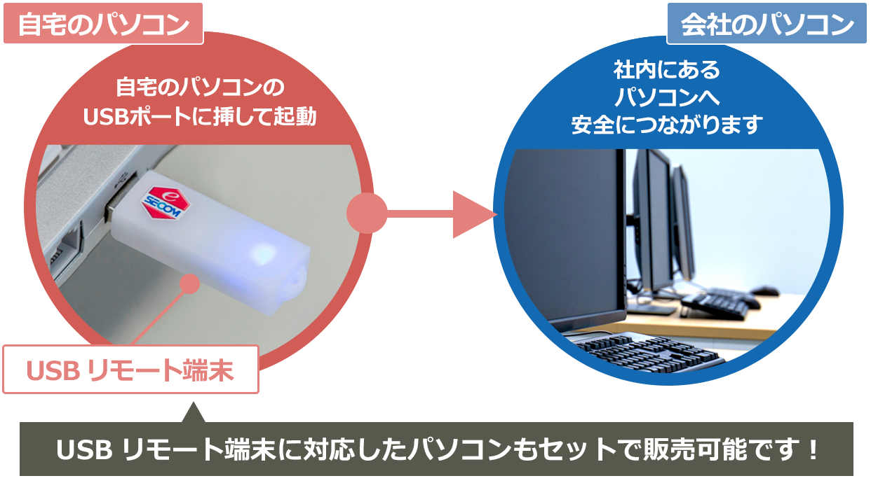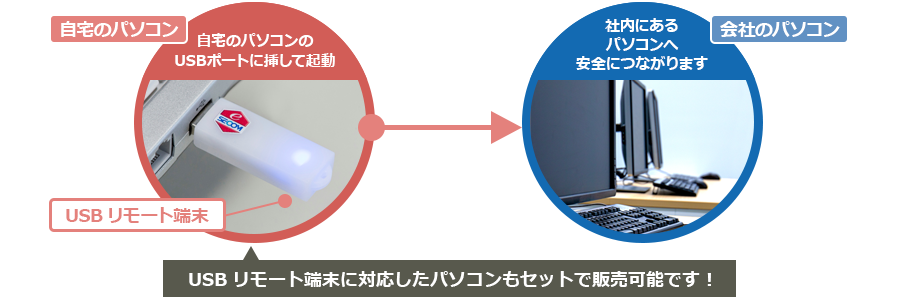 - USBリモート端末紛失時は会社のパソコンへのログインを遮断します(24時間365日対応)