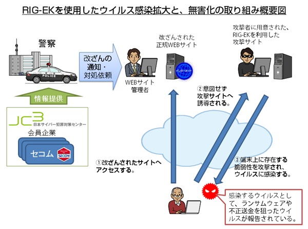 JC3では、参画企業と共に、RIG-EKを使用した不正プログラムに感染すると思われる改ざんサイトの情報を収集・調査し、警察へ提供いたしました。