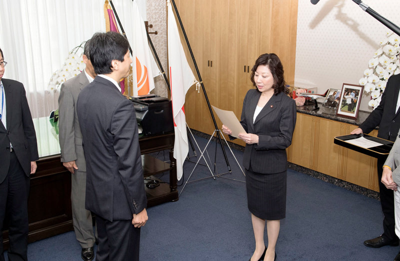 電子委任状取扱業務の認定式(2018年6月27日)にて野田総務大臣より認定書を交付される林社長