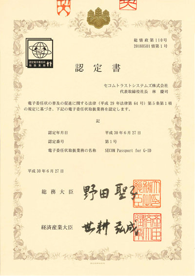 2018年6月27日、セコムトラストシステムズ株式会社は、総務省および経済産業省より「電子委任状の普及の促進に関する法律」に基づく「電子委任状取扱業務」の認定を第1号で取得しました。