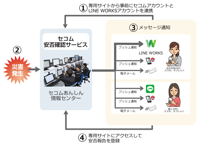 大規模災害時の初動対応として、「セコム安否確認サービス」からの安否報告依頼をLINE WORKS利用者がプッシュ通知で受け取ることで、会社支給の端末機器から「LINE WORKS」を利用した安否報告が可能となります。