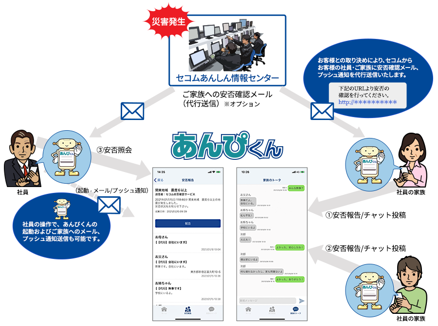 お客様との取り決めにより、セコムからお客様の社員・ご家族に安否確認メールを代行送信いたします。ご家族の安否が確認できることで、社員のみなさまは安心して避難(待機)、事業復旧ができます。