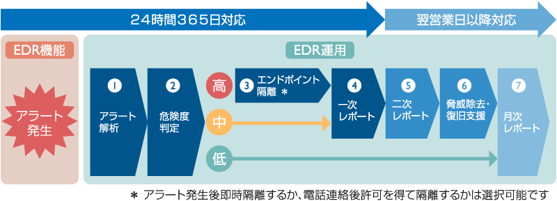 24時間365日体制でアラート情報を監視し、即時対応します。さらに、危険度の高い脅威に対する分析レポートを提供し、お客様のシステムから脅威の除去と復旧をサポートします。
