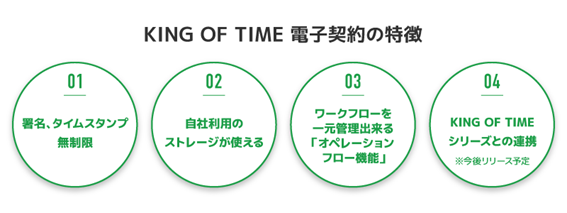 これにより、人事から勤怠管理、給与計算まで一元管理が可能なヒューマンテクノロジーズのサービス「KING OF TIME(キングオブタイム)」に、「セコムパスポート Plus」の電子証明書、タイムスタンプ、リモート署名などの機能が連携され、安全で利便性の高い新しいオプションサービス「KING OF TIME 電子契約」が提供開始されます。
